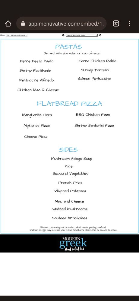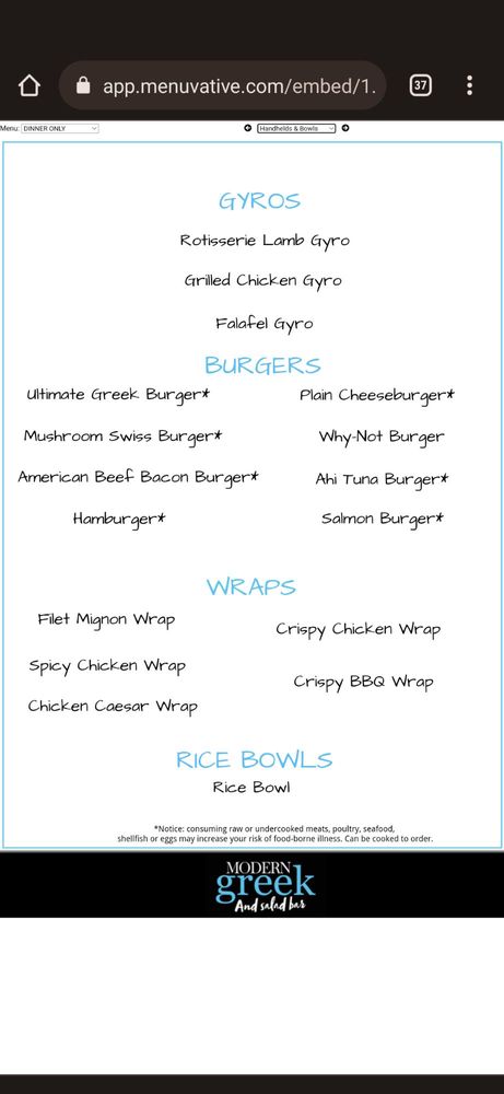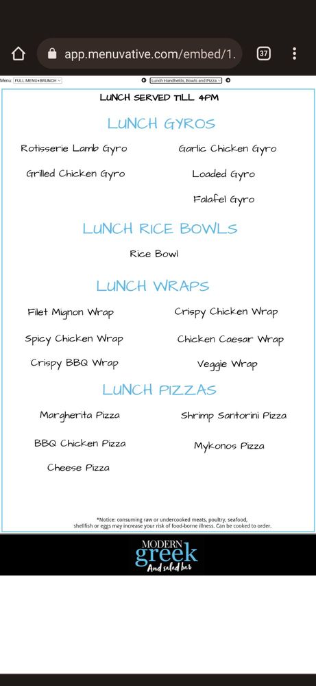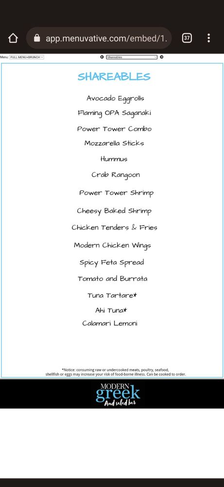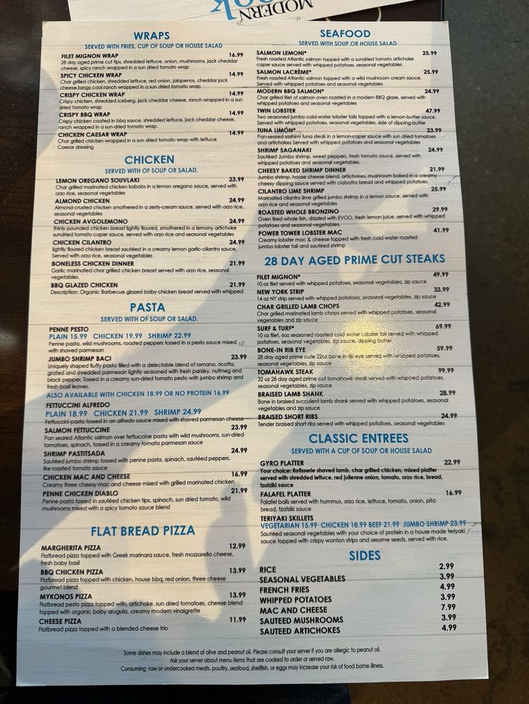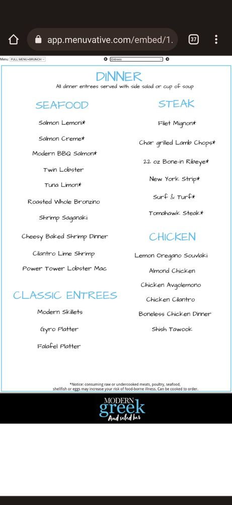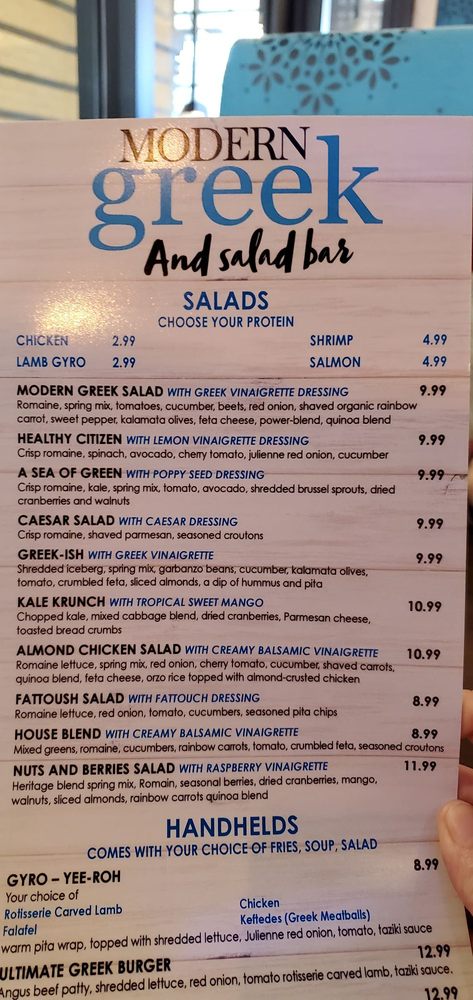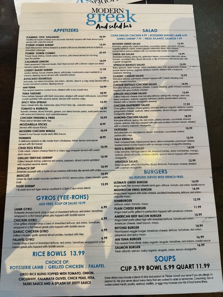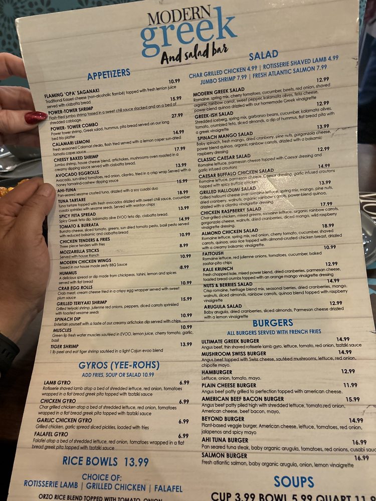 Modern Greek and Salad Bar is a trendy and upscale restaurant offering a wide range of Greek and salad options in Dearborn, MI. The menu includes flavorful Gyros & Rice Bowls like the loaded Rotisserie Lamb Gyro and the Falafel Rice Bowl. Appetizers like the Power Tower Shrimp and Tomato & Burrata provide a delightful start to the meal. The variety of soups, such as the Chicken Lemon Rice, add a comforting touch. Customers praise the friendly service and tasty dishes, particularly highlighting the fresh ingredients and generous portions. The outdoor seating and fast service make it a perfect choice for different occasions. Overall, Modern Greek and Salad Bar promises a delightful dining experience with its well-crafted menu and inviting ambiance.