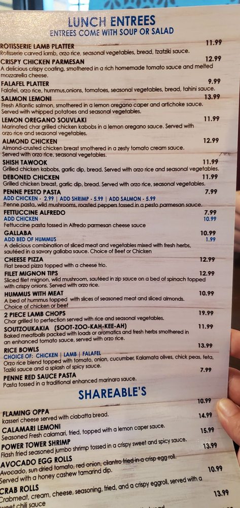 Lamb and chicken, orzo rice, tomato, onion, cucumber, kalamata olives, chickpeas, feta, tzatziki sauce and a splash of zesty sauce.
